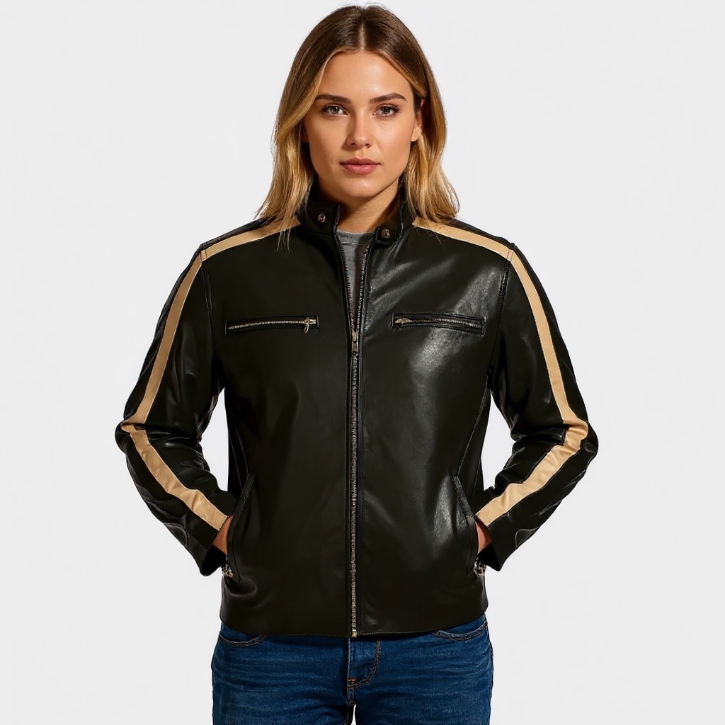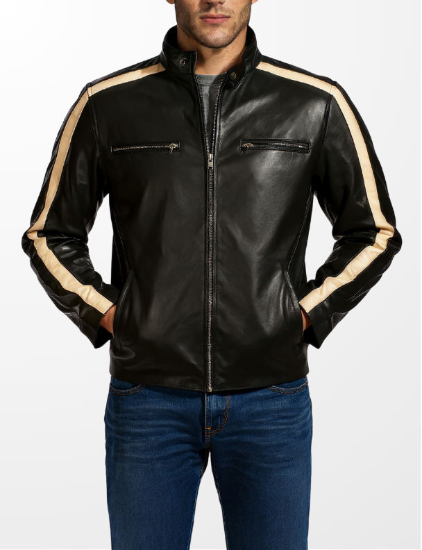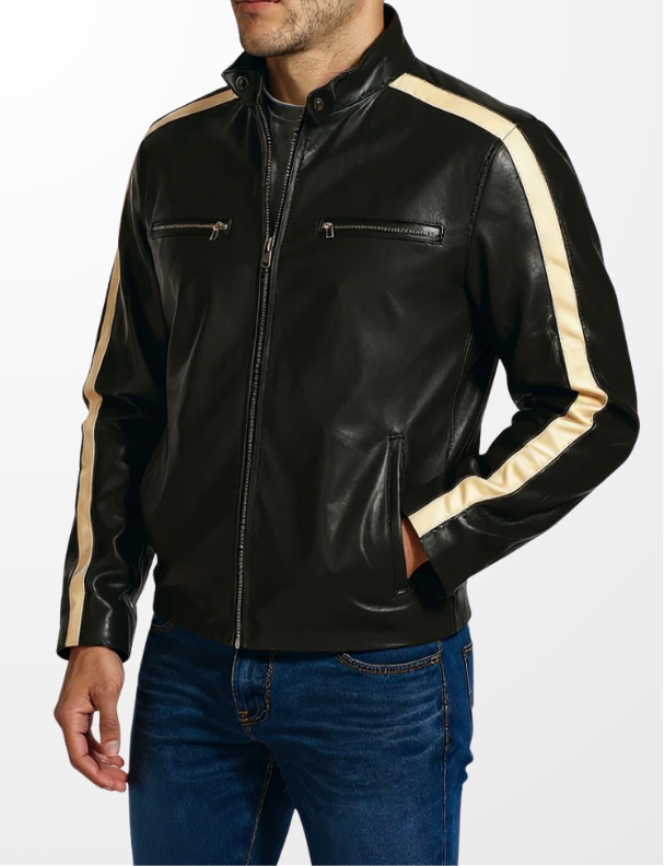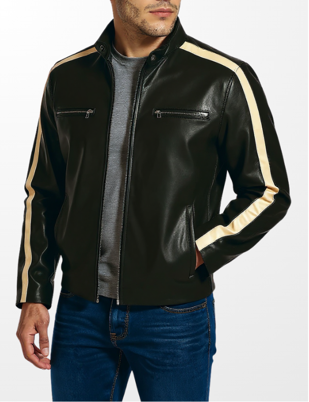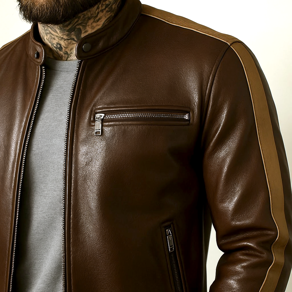 Bold tan racing stripes slash down each arm, giving this jacket its aggressive edge and sporty character. A snap-tab collar and four secure zip pockets combine function with sleek, road-ready aesthetics. The inner lining is crafted for comfort on long trips, while the structured shoulders and reinforced seams ensure The Bull holds its shape through every mile.