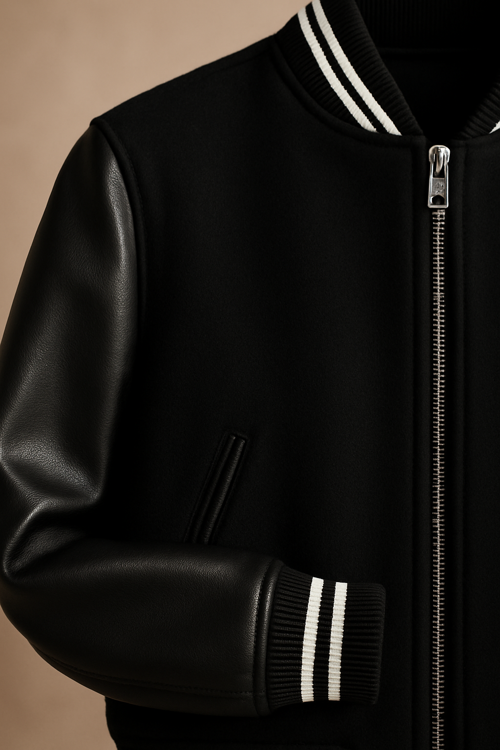 The Bulldog is a stripped-down classic varsity jacket built for everyday hustle with just enough attitude. Sharp contrast sleeves, bold ribbed trim, and heavyweight structure that wears like a uniform. Blank backside with option to add custom logo.