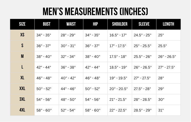 Measurements are taken in circumference. Refer to your Chest and Waist to determine your best fit. Size up if layering.