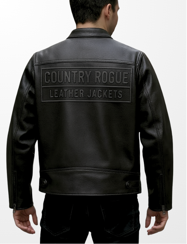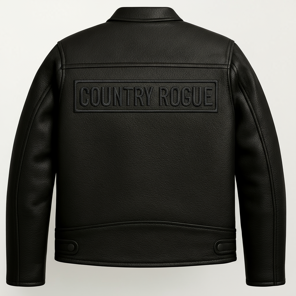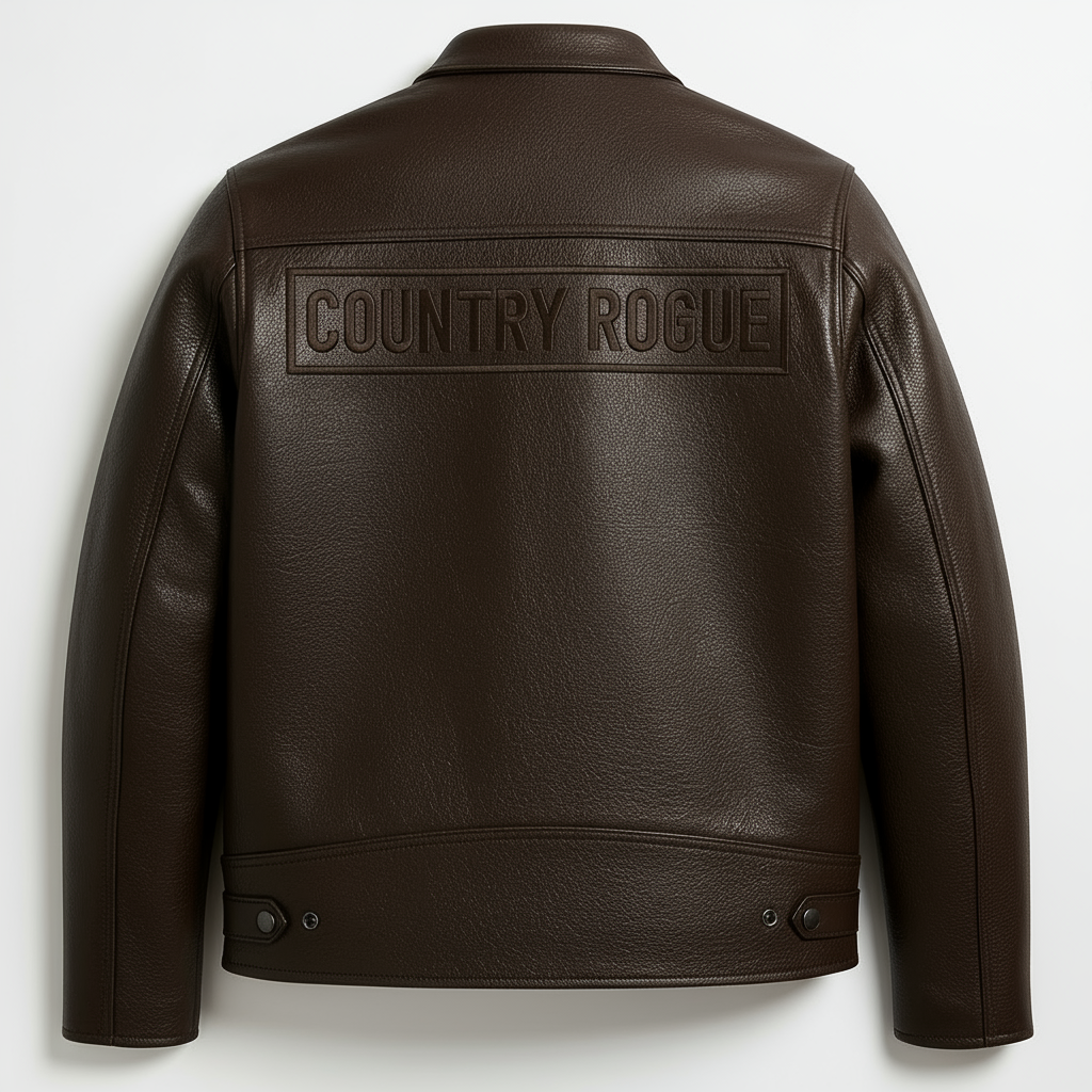 Embossed back panel with “Country Rogue Leather Jackets” branding